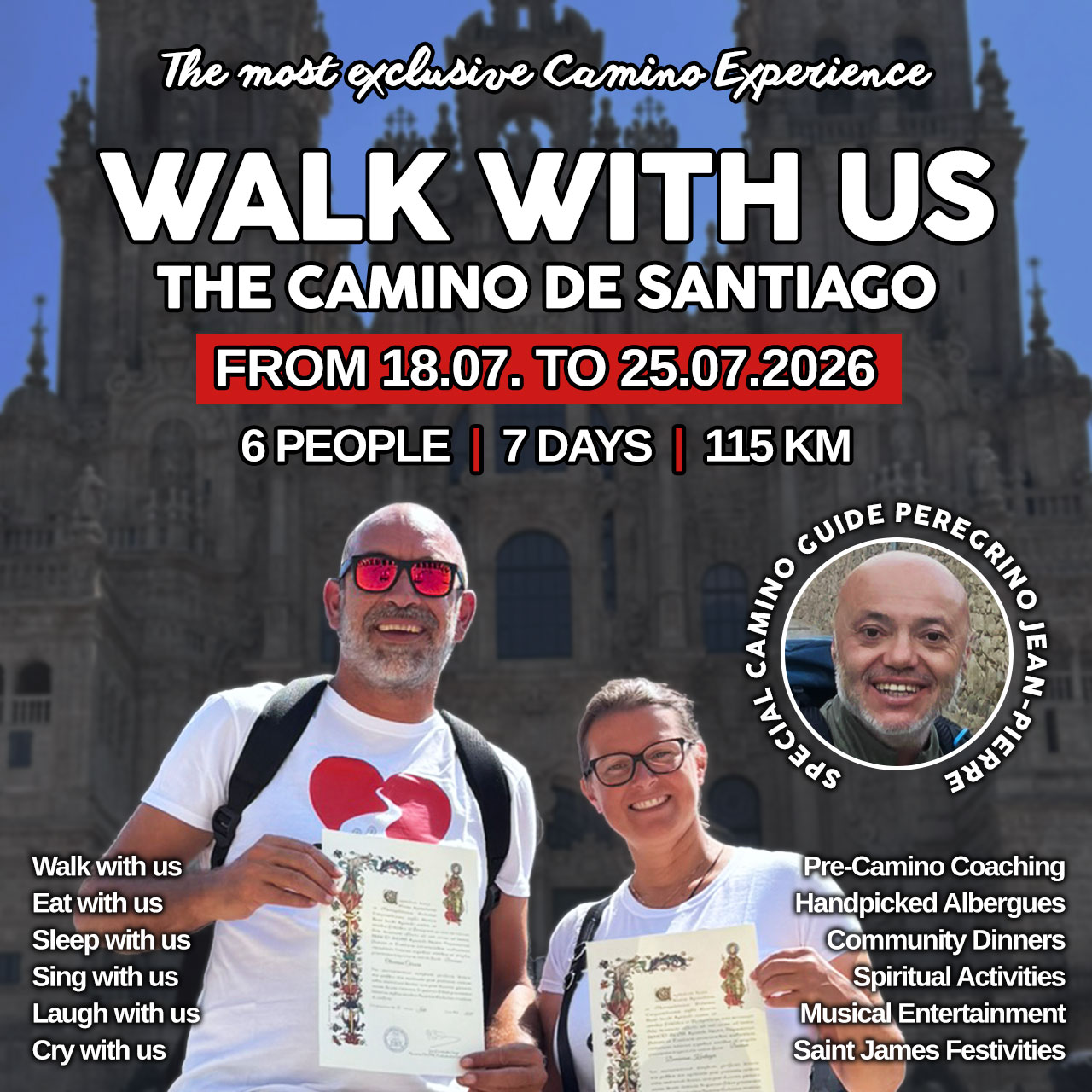 With 30.000 followers and over 15 million views of their Camino de Santiago videos, the Camino Lovers have become a source of inspiration for many people with their authentic, joyful attitude. Oliver's song, "The way (Buen Camino Peregrino)" has touched the soul of thousands of pilgrims all around the world. Now, for the first time, Dominique and Oliver invite you to experience the magic of the Camino together.